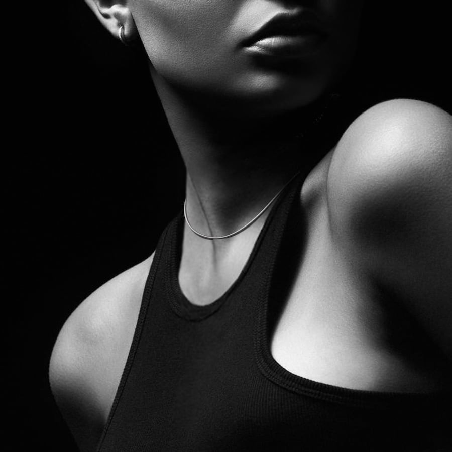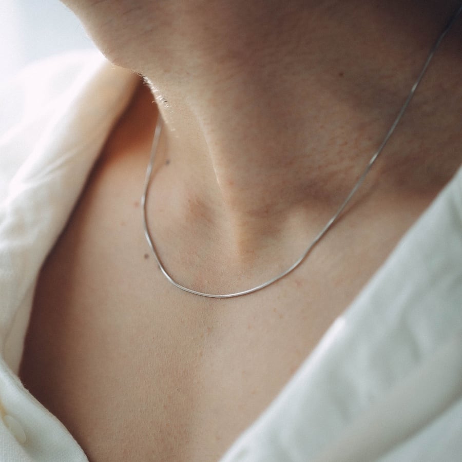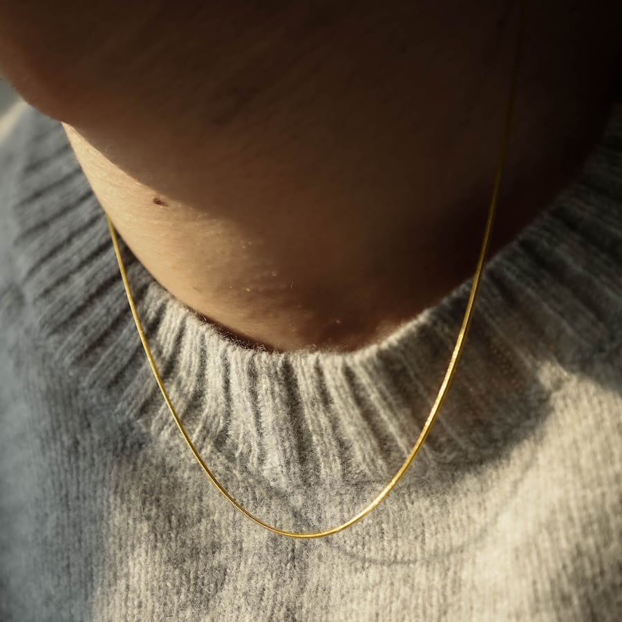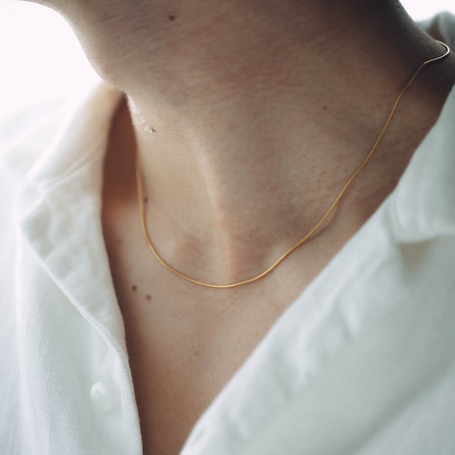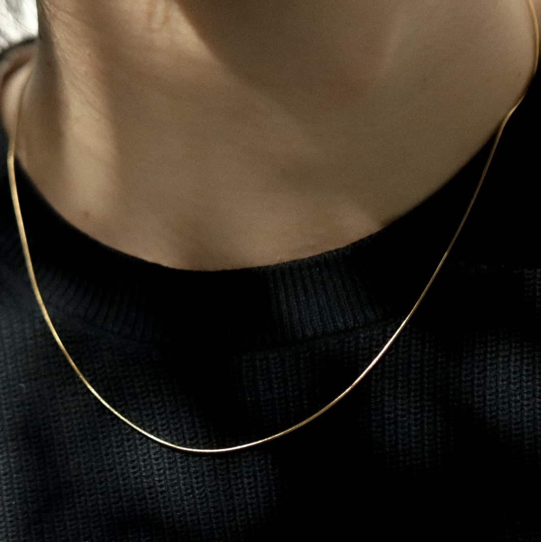 首元にしなやかに沿う細身のチェーンが、ミニマルながら上品な輝きを放ちます。