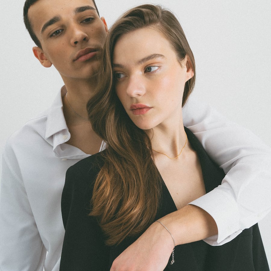 ゴールドとシルバー、そして異なるサイズ感が織りなすレイヤードスタイルは、特別感のあるコーディネートを演出します。