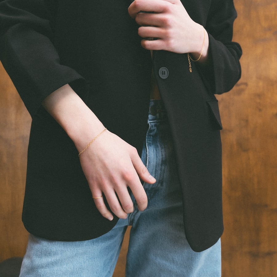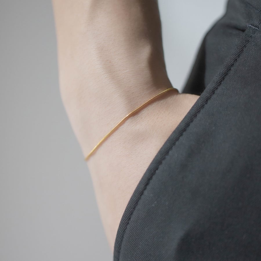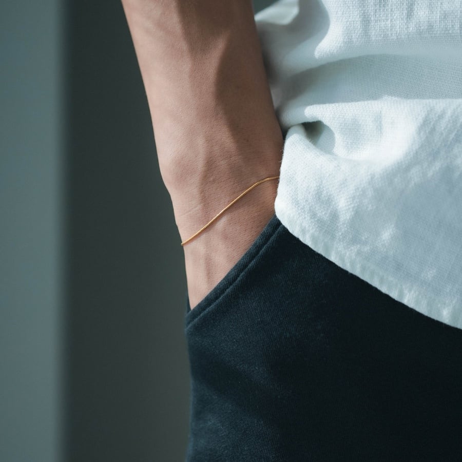 手首にやわらかく沿う細身のチェーンが、ミニマルながら上品な輝きを放ちます。