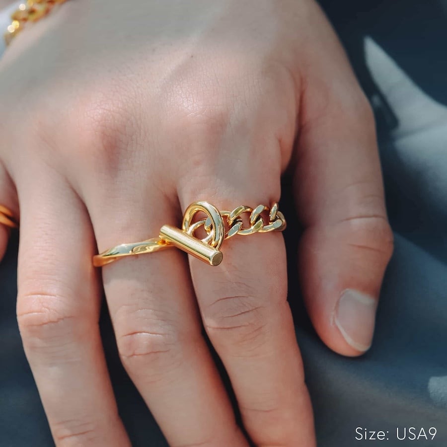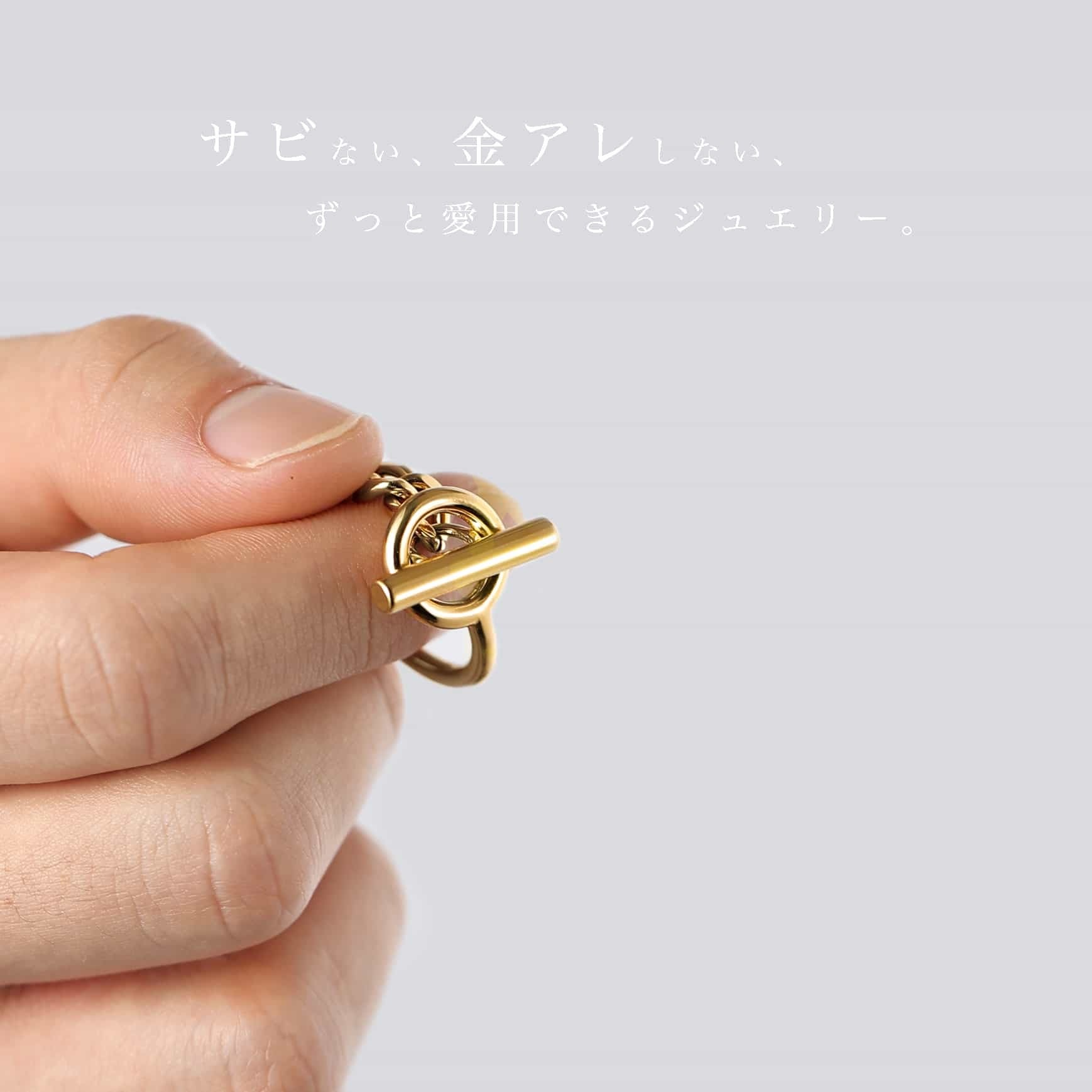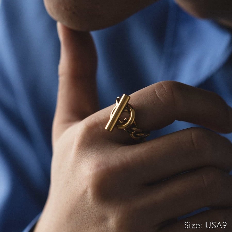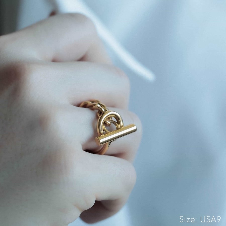 マンテルと呼ばれる留め具をモチーフにしたユニークで存在感のあるチェーンリング。